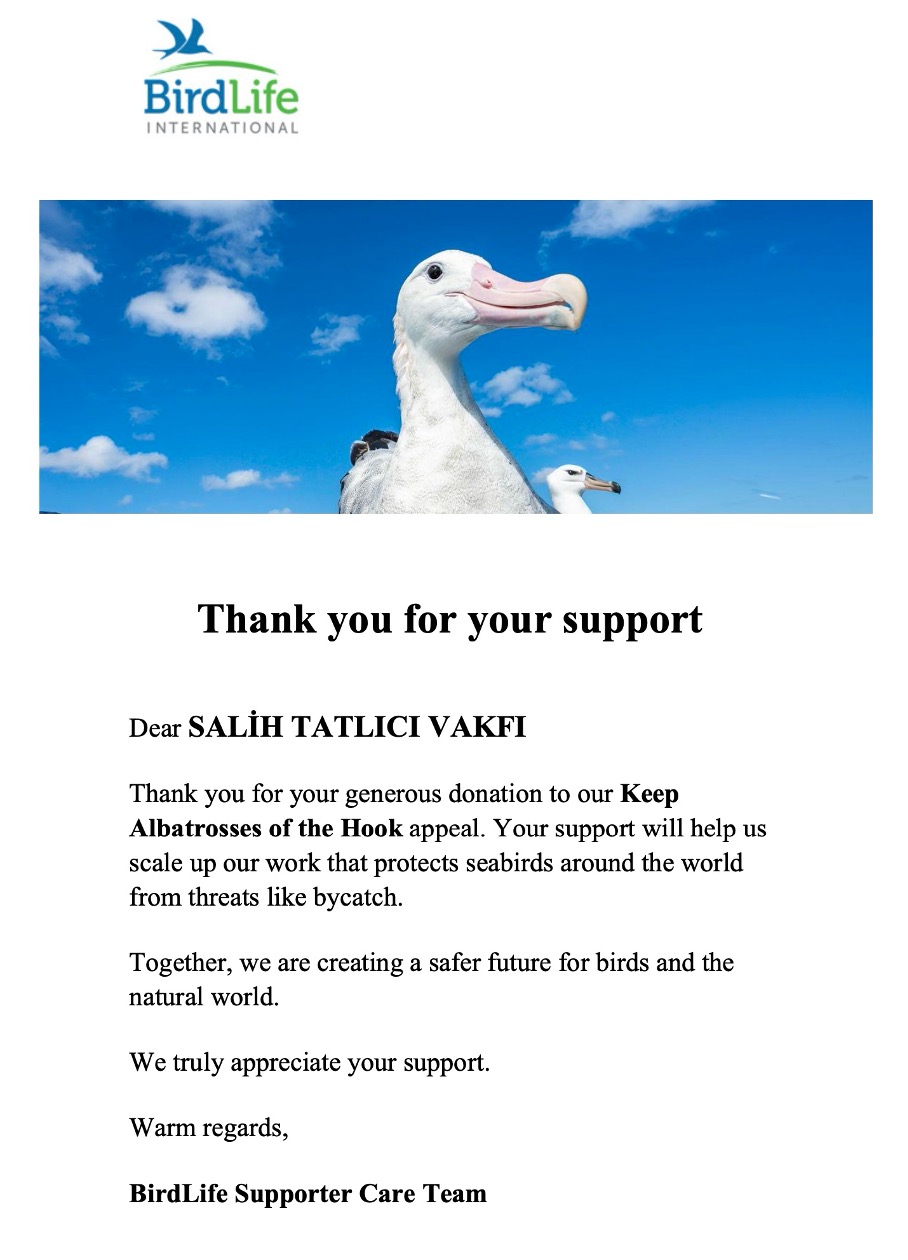 Dünya Göçmen Kuş Günü (WMBD), 2006 yılında başlatılan göçmen kuşların ve yaşam alanlarının korunması ihtiyacını vurgulayan yıllık bir farkındalık yaratma kampanyasıdır. Dünya Göçmen Kuş Günü, her yıl Ekim ayının ikinci Cumartesi Günü kutlanmaktadır. Vakıf olarak; milyonlarca yıldır okyanuslarda ustalaşmış, binlerce mil yol kat etmiş ve sonsuz ufuklarda yol almak için en şiddetli fırtınalara göğüs germiş olan ALBATROSLARIN sonsuza dek oltadan uzak kalmasına yardımcı olmak, on binlerce ALBATROSUN ve yüz binlerce deniz kuşunun ölümünü önleyebilecek hayati önem taşıyan uluslararası çalışmaları desteklemek için doğa koruma alanında en büyük uluslararası ortaklık olan, asırlık “BirdLife International” organizasyonuna bağışta bulunduk. Bağışla ilgili olarak organizasyon tarafından Vakfımıza teşekkür belgesi sunuldu.